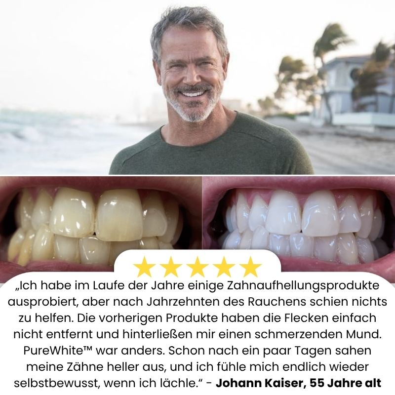 Müde, Ihr Lächeln wegen gelber Zähne zu verstecken? PureWhite™ liefert sichtbare Ergebnisse in nur 5 Tagen und verleiht Ihnen die weißeren, strahlenderen Zähne, die Sie sich immer gewünscht haben. Geben Sie sich nicht mit weniger als Perfektion zufrieden.
